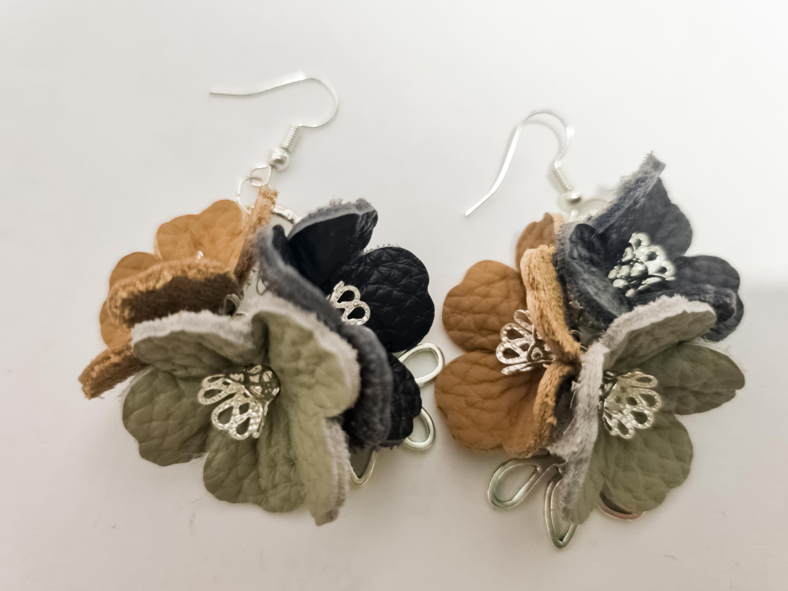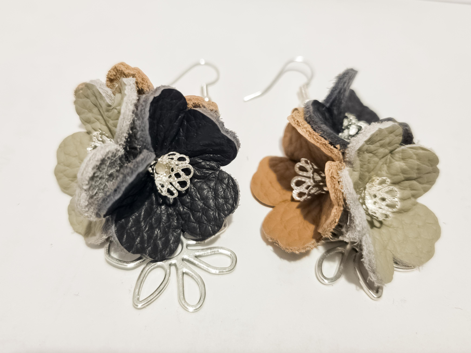 Cercei unicat confectionati din piele naturala si accesorii metalice hipoalergenice.